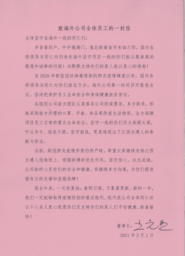 當(dāng)前,新冠肺炎疫情形勢(shì)仍然嚴(yán)峻。希望大家繼續(xù)發(fā)揚(yáng)江西水建人迎難而上、頑強(qiáng)拼搏的優(yōu)良作風(fēng),堅(jiān)定信心,眾志成城。公司始終心系你們的安全和健康,將繼續(xù)多方溝通,為你們提供強(qiáng)有力的支撐和堅(jiān)強(qiáng)保障!