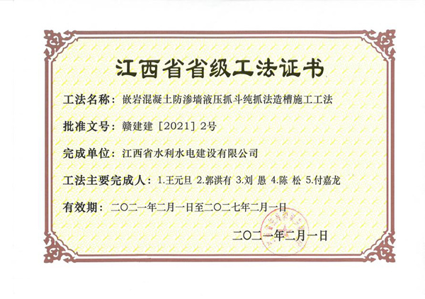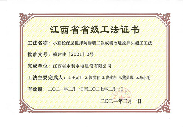 2021年2月1日,江西省住房和城鄉(xiāng)建設廳文件《關于公布我省2020年度第二批省級工程建設工法的通知》(贛建建〔2021〕2號)公布了2021年度第二批省級工程建設工法評審結果,其中,公司申報的《小直徑深層攪拌防滲墻二次成墻改進攪拌頭施工工法》、《嵌巖混凝土防滲墻液壓抓斗純抓發(fā)造槽施工工法》審定為“2020年度省級工程建設工法”。