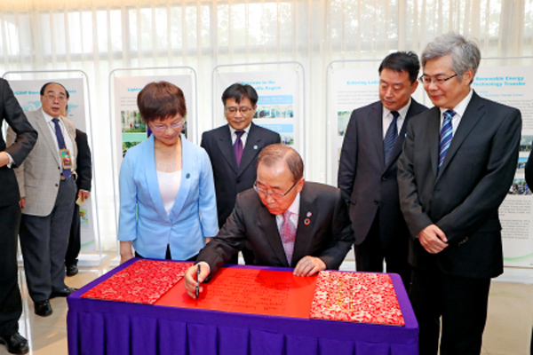 潘基文表示,國際小水電中心是中國與聯(lián)合國開展南南合作的典范,是習(xí)近平主席倡導(dǎo)和支持的南南合作的杰出代表。潘基文為國際小水電中心題詞:“Small hydropower is an important renewable energy. I hope the International Center on Small Hydro Power (ICSHP) continues to make great contributions to the development of small hydropower worldwide.”