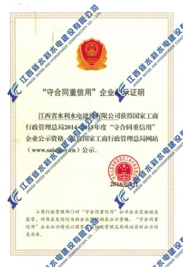 2016年我公司首次榮獲國家工商行政管理總局2014-2015年度“守合同重信用”企業(yè)公示資格?!笆睾贤匦庞谩惫净顒?,是工商部門依托合同行政監(jiān)管職能組織開展的旨在推進(jìn)企業(yè)信用建設(shè)的“守重”企業(yè)公示活動,是長期以來我國社會信用體系建設(shè)的重要組成部分。