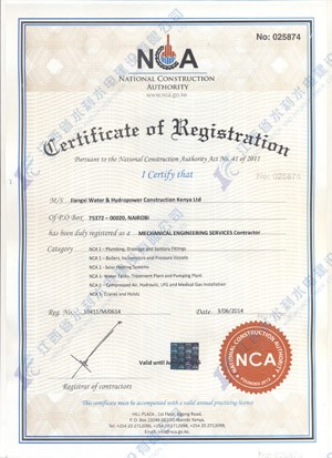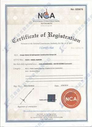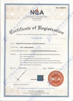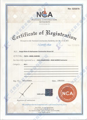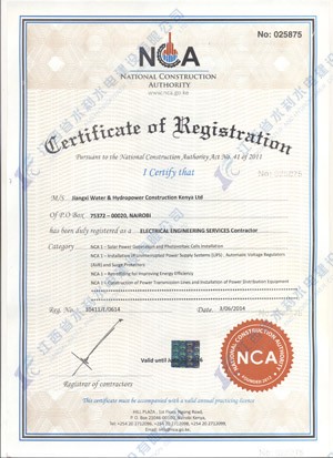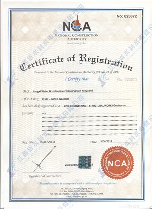 江西省水利水電建設(shè)有限公司肯尼亞分公司接到通告后,積極準(zhǔn)備相關(guān)資料,憑借公司的技術(shù)實(shí)力和肯尼亞市場(chǎng)的良好業(yè)績(jī),最終取得所有六項(xiàng)的一級(jí)證書。其中包括:水利施工一級(jí),公路工程施工一級(jí),房屋建筑工程施工一級(jí),結(jié)構(gòu)施工一級(jí),電力工程施工一級(jí)和機(jī)電工程施工一級(jí),有力地提升公司的品牌影響,提升了公司資信競(jìng)爭(zhēng)力,為公司在肯尼亞各項(xiàng)工作的全面深入開(kāi)展創(chuàng)造了積極有利的條件。