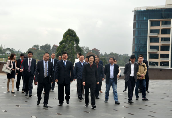 訪問(wèn)團(tuán)一行首先參觀了雙河商貿(mào)中心,對(duì)雙河項(xiàng)目給予了充分肯定。座談期間,公司董事長(zhǎng)王元旦及江西國(guó)際、江西中煤等駐肯企業(yè)代表逐一就企業(yè)在肯尼亞的發(fā)展情況進(jìn)行匯報(bào)。馮桃蓮主任充分贊揚(yáng)了江西企業(yè)在肯尼亞的各項(xiàng)優(yōu)秀業(yè)績(jī),同時(shí)指出,在省委、省政府的正確領(lǐng)導(dǎo)下,希望各駐肯企業(yè)能夠緊密合作、抱團(tuán)發(fā)展,加強(qiáng)安全管控,提升企業(yè)抗風(fēng)險(xiǎn)能力,樹(shù)立良好的企業(yè)形象。