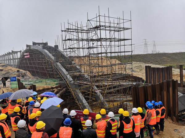 首日,學(xué)習(xí)團(tuán)冒著寒風(fēng)和細(xì)雨,先后參觀了西干渠三區(qū)地下頂管技術(shù)現(xiàn)場、渡王家渡拱式渡槽技術(shù)現(xiàn)場,一分干渠曾家渡碗式渡槽完工段。彭燦華、曾俊平、馬小毛等項(xiàng)目管理人員,先后就技術(shù)特點(diǎn)、質(zhì)量安全控制要點(diǎn)、技術(shù)方案比選、經(jīng)濟(jì)效益分析等,向?qū)W習(xí)團(tuán)一行作了介紹。
