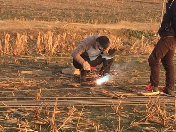 圖為官田機耕橋鋼筋制作現(xiàn)場,圖中為李金瑞經(jīng)理在點焊鋼筋