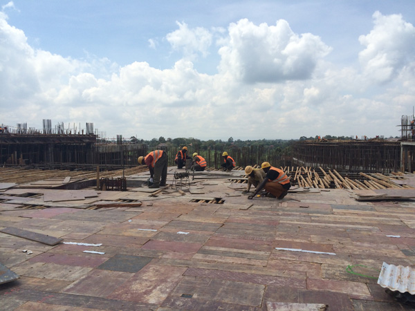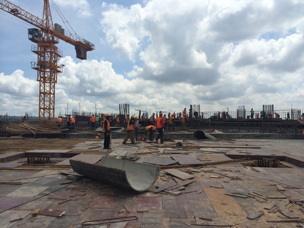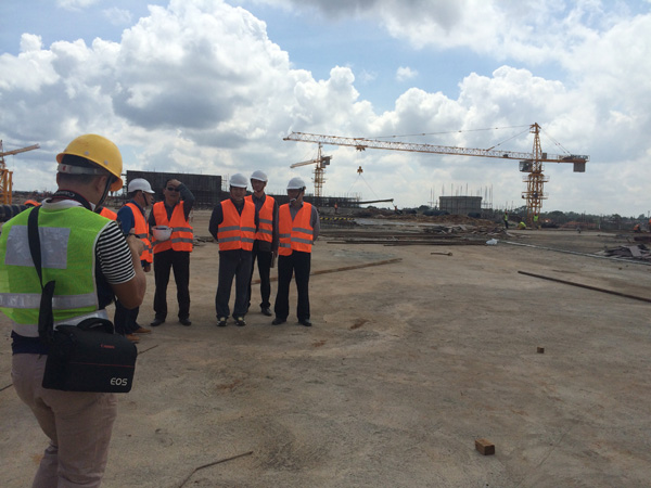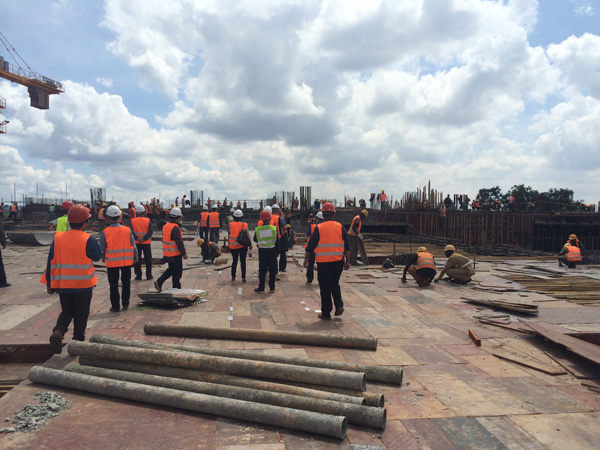 “雙河”項目是一個集零售商場、現代辦公樓、公共娛樂以及配套設施的綜合性工程,作為東非最大的在建城市綜合體,總建筑面積為18.2萬平方米,單層面積就超過四萬多平米。雖然出國前我對“雙河”項目就有一定的了解,但親臨現場,感受工地的壯觀,內心仍然受到巨大的震撼。這個項目涉及到的工程類別較多,施工統(tǒng)籌及安全質量監(jiān)控難度較大。在施工現場,我們看到各作業(yè)工種工作安排得井井有條,各類安全標識及安全設施科學規(guī)范,雖然現場施工作業(yè)人數超過1000多人,但讓人感覺既熱火朝天,又忙而不亂有條不紊地進行著。