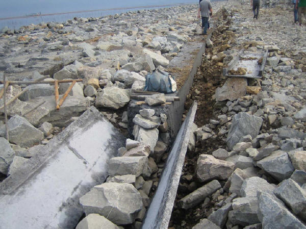 整坡后的土基密實(shí)度、坡比、坡頂和坡底高程;充灌后用探針測(cè)量混凝土厚度;抗壓強(qiáng)度、抗凍指標(biāo);應(yīng)采用鉆芯取樣檢測(cè)抗壓強(qiáng)度、充灌厚度。