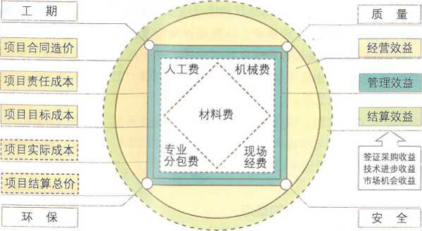 “方圓圖”是具有操作性的工具。其一,“方圓圖” 完整詮釋了建筑項目管理行為間的關(guān)系?!敖禹椖俊贝_定了合同造價,對應(yīng)方圓圖的實線圓;“做項目”的第一步是下達(dá)項目目標(biāo)責(zé)任書,確定項目責(zé)任成本,對應(yīng)方圓圖的責(zé)任成本方形,第二步分子公司在責(zé)任書的基礎(chǔ)上進(jìn)行項目實施策劃,產(chǎn)生項目的目標(biāo)成本,對應(yīng)方圓圖的目標(biāo)成本方形,第三步就是項目實施過程的管控,最終確定實際成本,對應(yīng)方圓圖的實際成本方形。“算賬收錢”就是完成項目過程中的結(jié)算變更與最后的決算收款,從而確定結(jié)算造價,對應(yīng)方圓圖的結(jié)夢造價虛線圓。項目實施過程中進(jìn)度、質(zhì)量、安全、環(huán)保及周邊相關(guān) 方的管理對應(yīng)成本方形的四個支撐頂點,構(gòu)成成本的五項費(fèi)用“材料、人工、機(jī)械、現(xiàn)場經(jīng)費(fèi)、專業(yè)分包”對應(yīng)成本方形的內(nèi)部區(qū)域。